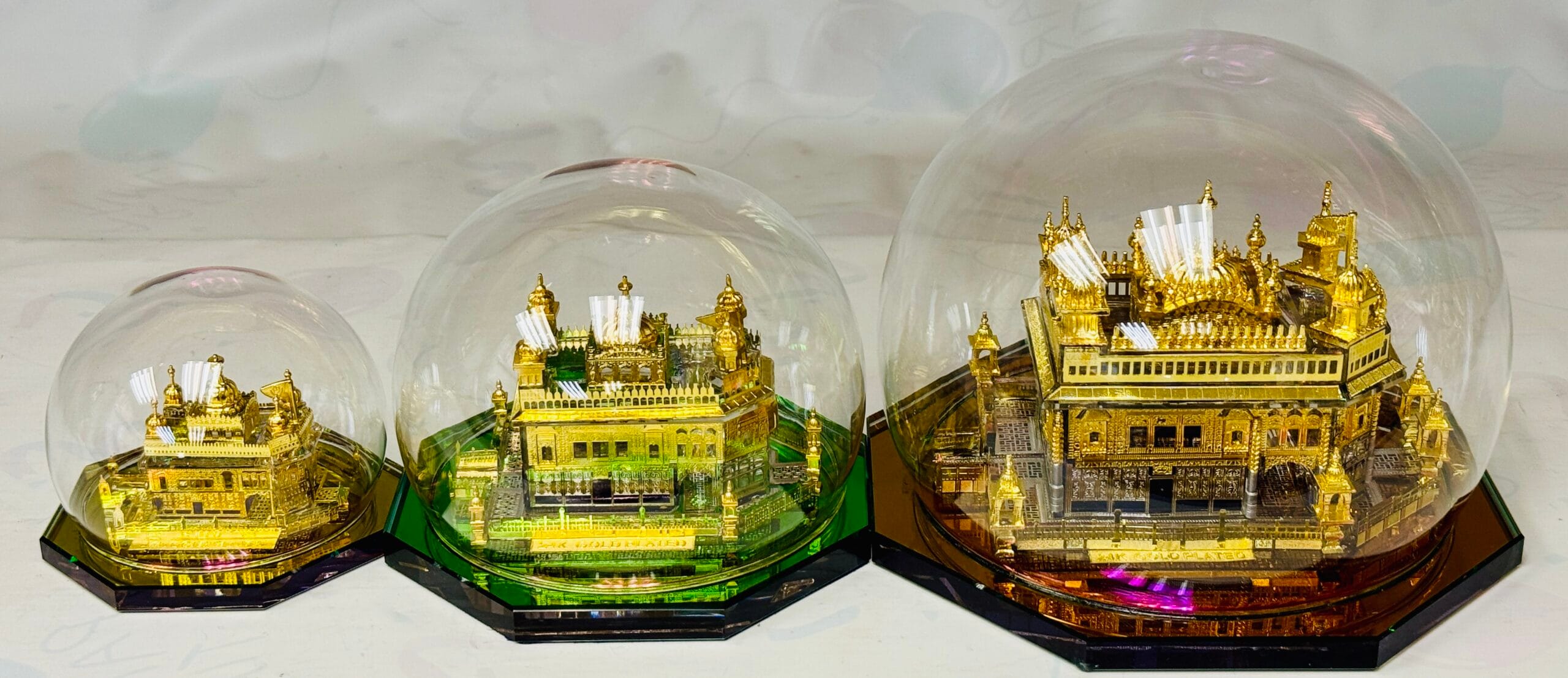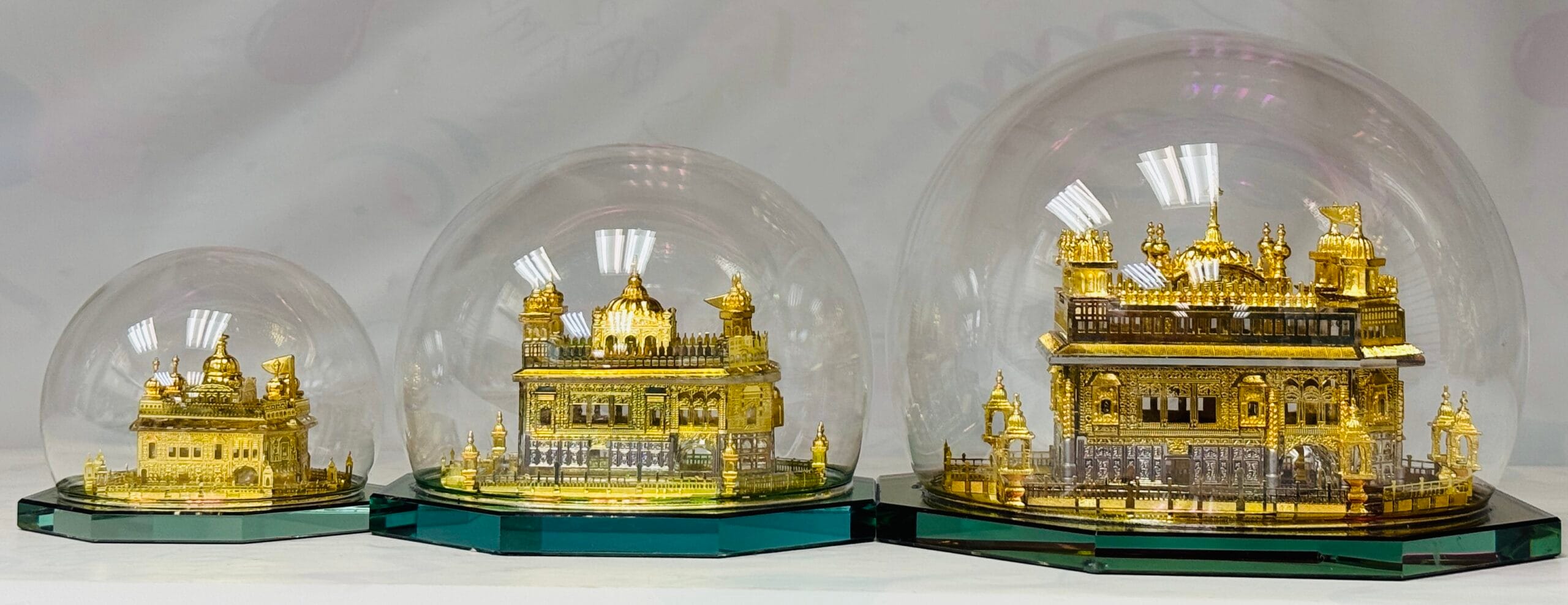 Beautiful decorative model of the Golden Temple available in three different sizes. Each piece comes with an elegant glass display case, perfect for home décor, prayer rooms, or as a meaningful gift.
