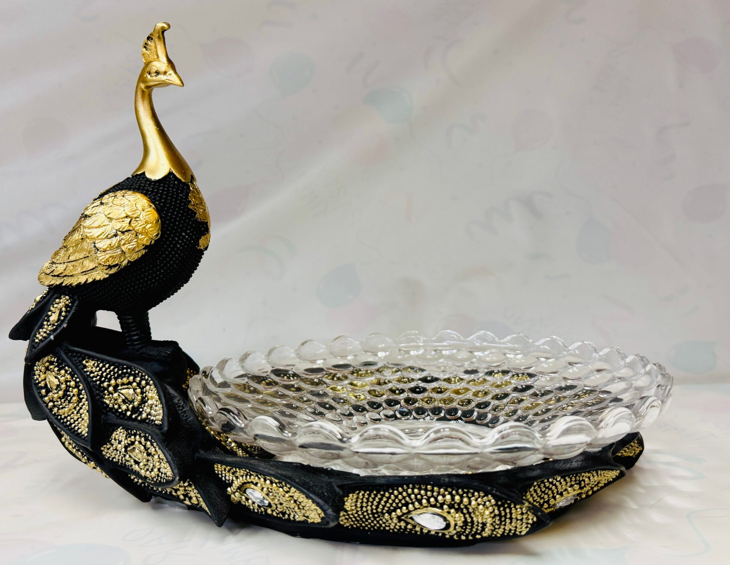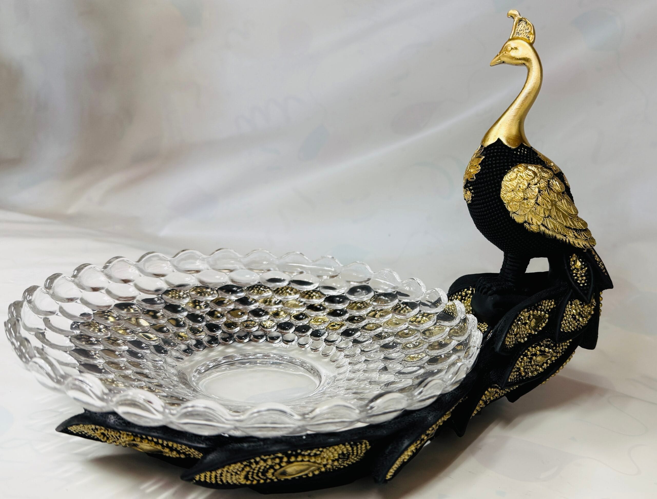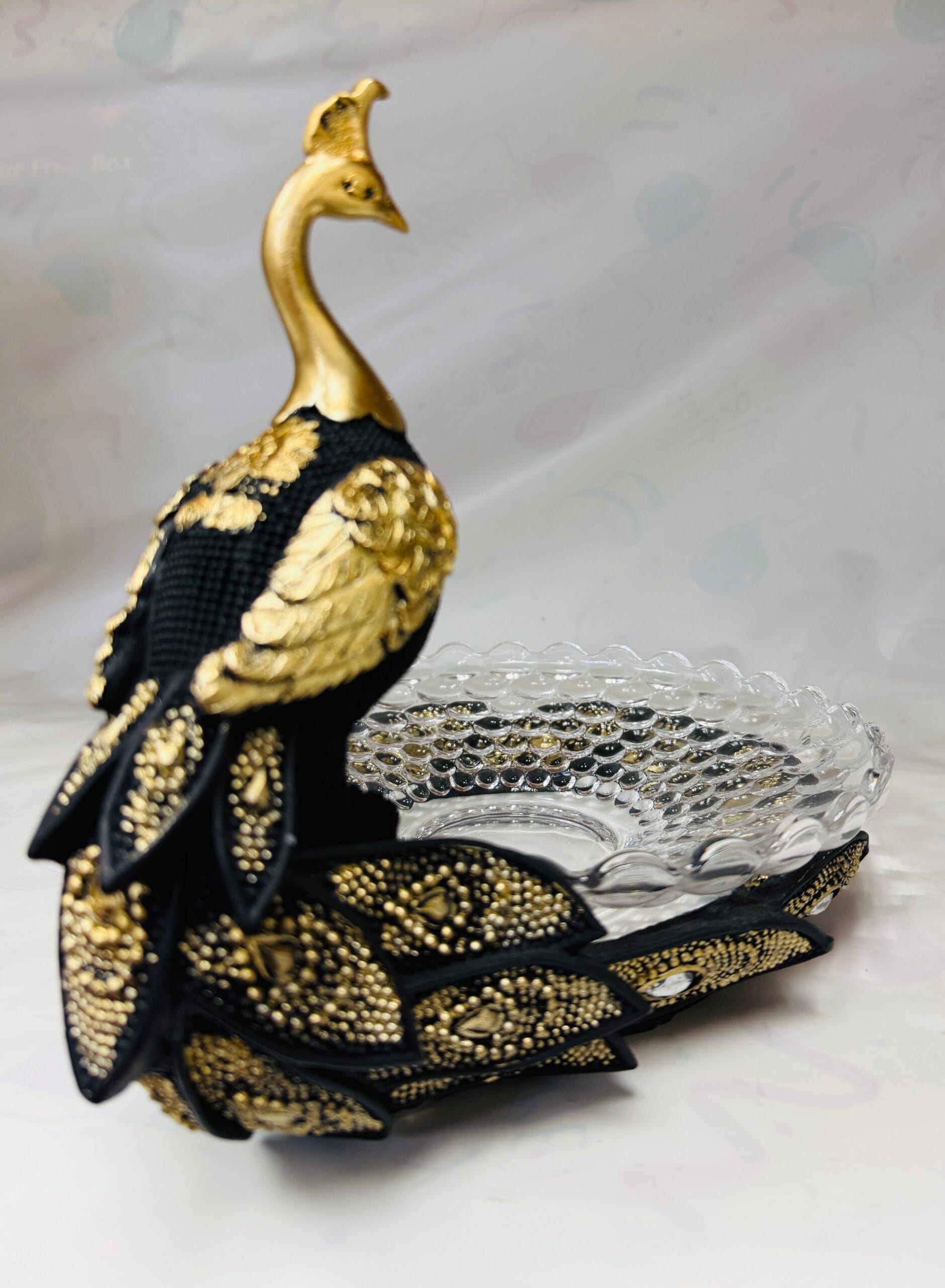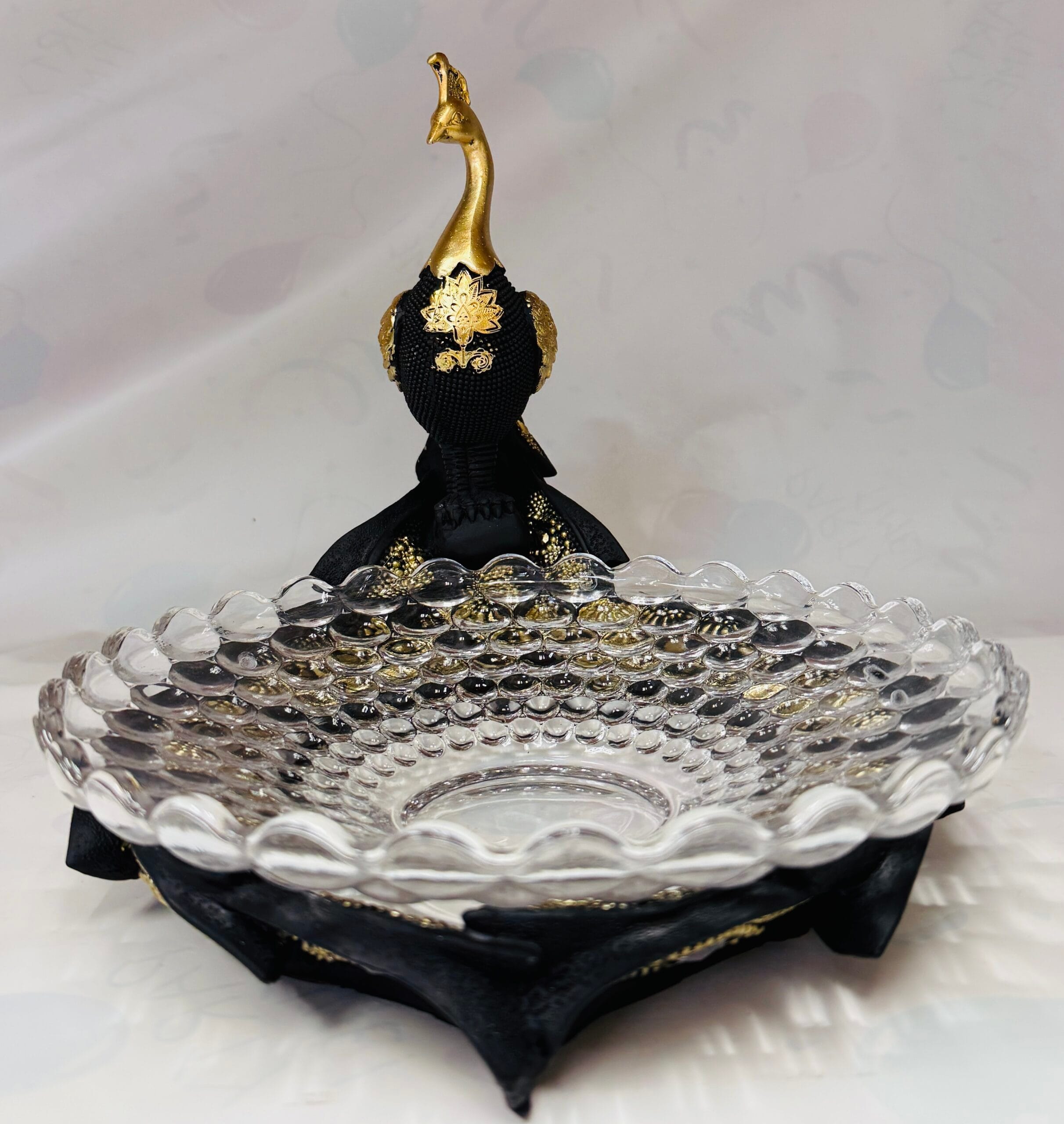 Peacock with crystal glass bowl